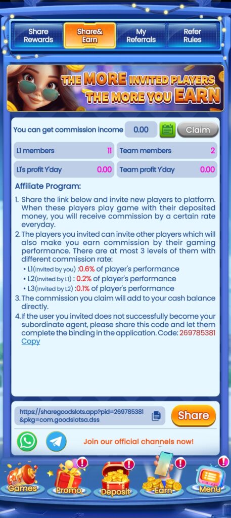 GOOD SLOTS Share the link below and invite new players to platform. When these players play game with their deposited money, you will receive commission by a certain rate everyday.2. The players you invited can invite other players which will also make you earn commission by their gaming performance. There are at most 3 levels of them with different commission